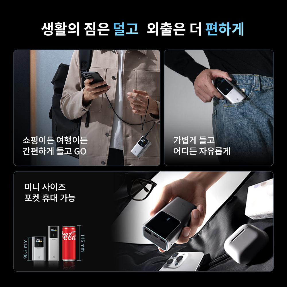 미니 사이즈, 어디든 간편하게 포켓 티슈만한 크기, 무게는 약 217g10,000mAh 초소형 대용량