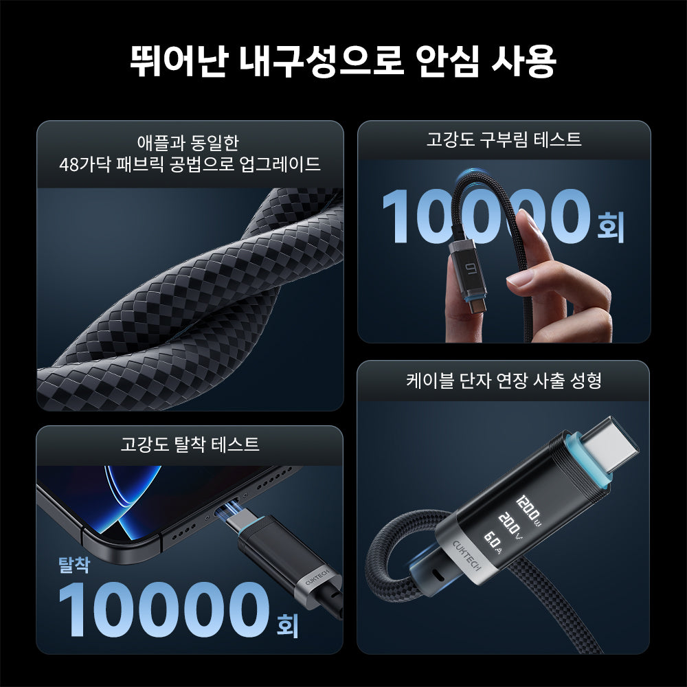 뛰어난 내구성의 패브릭 케이블로 안심하고 사용할 수 있음 아이폰과 동일한 48가닥 직조 공법으로 수만 번의 탈착 및 구부림 테스트