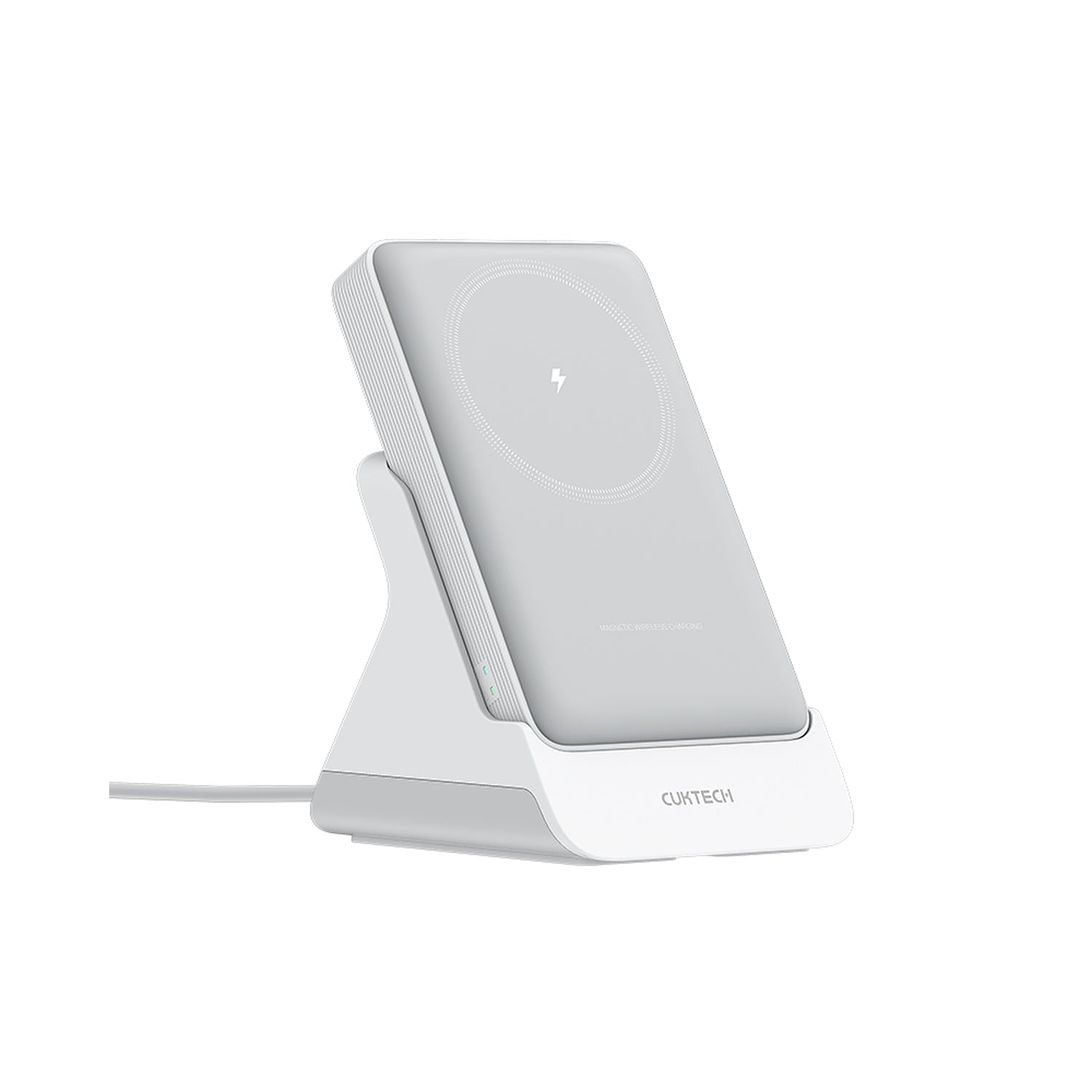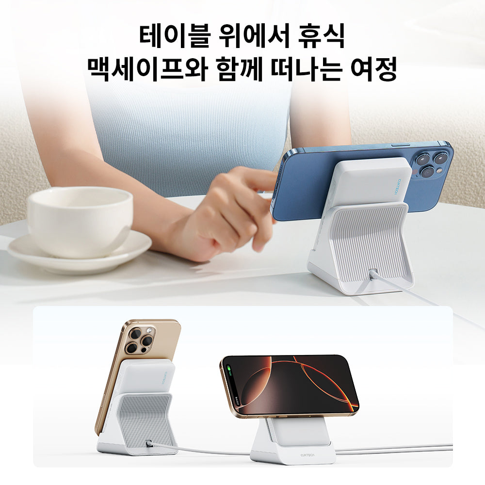 【충전 거치대 포함】 미끄럼방지 패드와 균형추로 안정적 고정, 전원 연결 시 책상용 무선 충전기로 활용 가능. 거치대과 보조배터리는 자기흡착 설계로 접점 충전 지원, 보조배터리와 휴대폰 동시 충전 가능. 보조배터리 거치대에 올리면 자동 충전 시작, 항상 완전 충전 상태 유지.