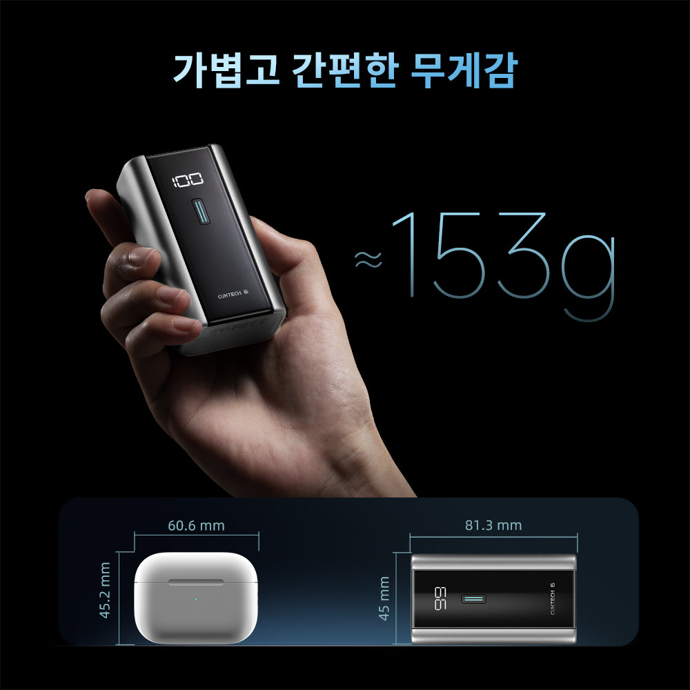 가볍고 편리한 휴대성153g 의 가볍고 컴팩트한 파워뱅크는 휴대가 간편하며, 신용카드 사이즈보다 21%줄어든 정면 크기,주머니에 부담 없이 쉽게 들어갑니다.