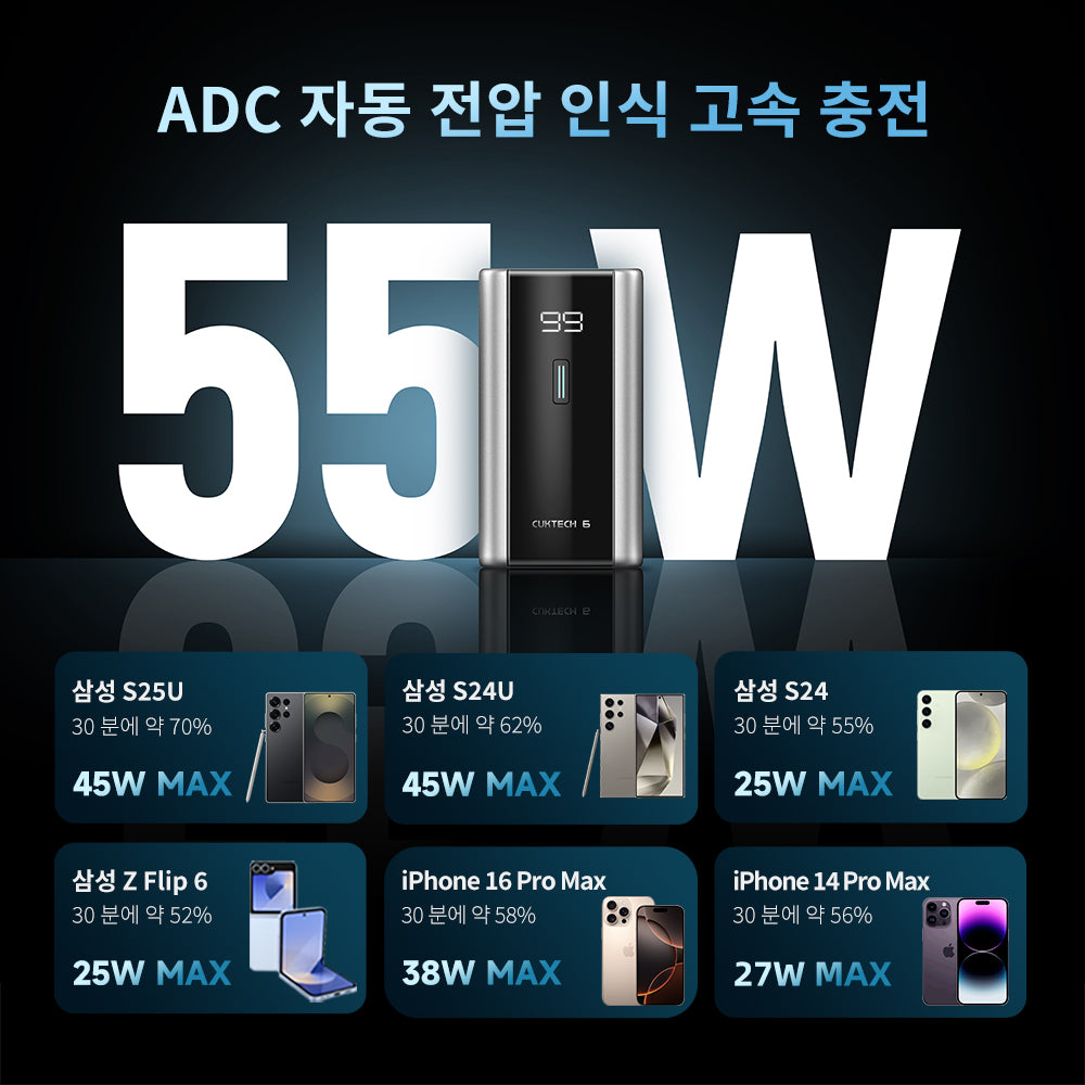 고효율 고속 충전C1포트 55W MAX의 고속 충전 덕분에 기기를 신속하게 충전하여 바쁜 날에도 완벽하게 대응할 수 있습니다.